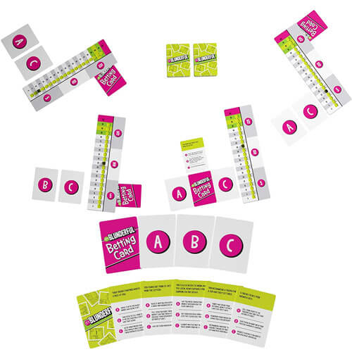 The game has fun, non-offensive content that's relatable to adults so you can play with all of your adult friends and family. The strategic betting component raises the stakes for competitive players and keeps all players involved in every turn. Each player has their own betting scorecard used to place their bets. Read the Blunderful card and secretly choose how you would react. Other players place their bets on how they believe you would react. Everyone reveals their answers. Players who guessed the correct answer gain the points they wagered, but those who guessed incorrectly lose the number of points they wagered. The first person to reach 100 points wins.
