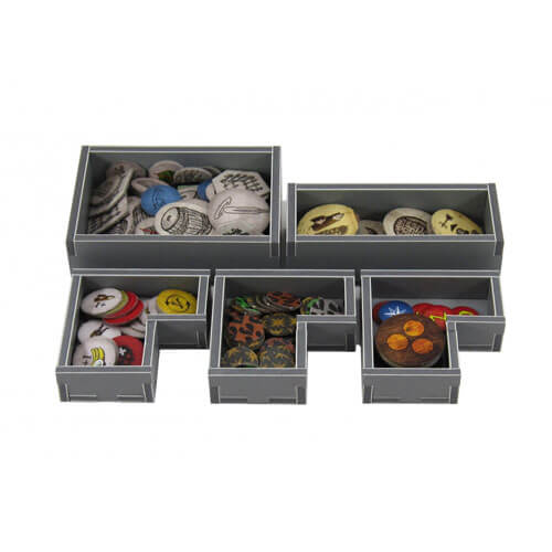 This Campaign 3 insert is designed to be compatible with Robinson Crusoe® and the Voyage of the Beagle Vol. 1 ® expansion. The design provides both efficient storage and improved game play. The trays can be utilised during the game, and they greatly aid set-up and clear-away times. The rules and boards act as a lid on top of the trays. The insert is arranged in two layers as shown. Note that the island hexagon tiles and first player token are stored in between the other trays at the bottom of the image.