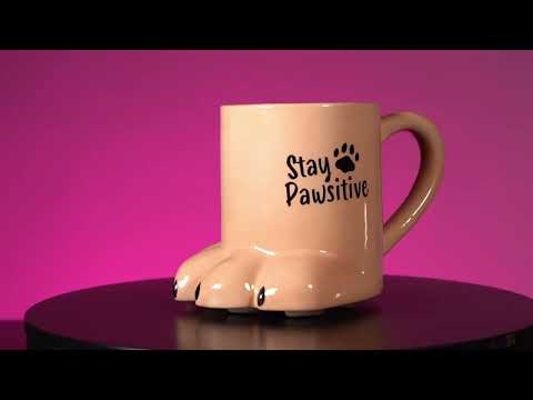 Adorable 3D mug shaped like a cat's paw. Purr-fect for the cat lover in your life! Featuring grey accents and a punny phrase that reads 'Stay Pawsitive'.