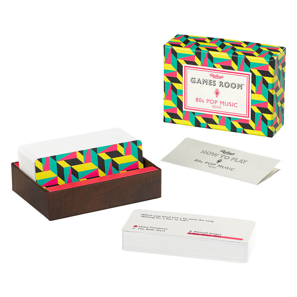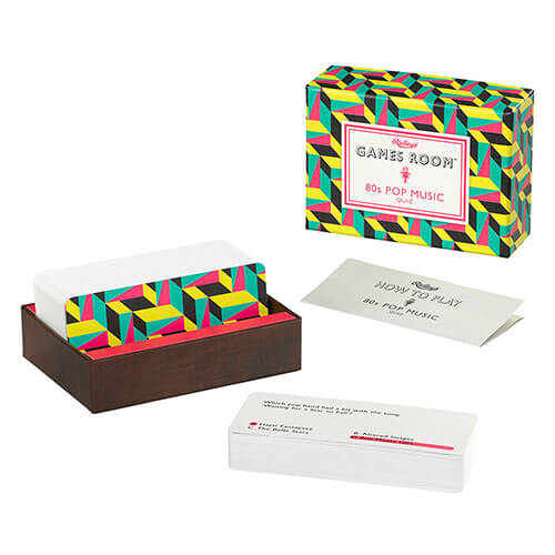 - Features 140 multiple choice question cards presented in a 90s-inspired geometric box.