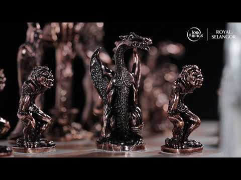 The battle for Middle-earth begins. Aragorn and Galadriel lead a band of Ents, Wizards and Hobbits against Sauron and Shelob's horde of Saruman, Gollum, Dragons and Orcs. Cast in pewter, with copper plating to distinguish the opposing armies, play takes place on a chessboard of wood and pewter marquetry.